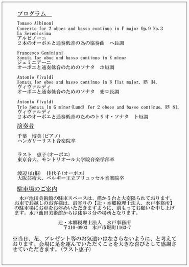 クリスマスクラシックコンサート~オーボエ2本と通奏低音による~東京押上の十間通りにある、長屋カフェ「天眞庵」にて。オーボエ 渡辺佳代子、ラスト恵子、ピアノ 長久真実子。19時スタート。チケット4000円 ディナー(手打ちそば、飲み物)付き。定員18名。 |